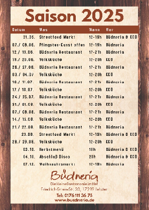 ab Ostern 2022 freuen wir uns über Zuwachs in der Büdnerei Lehsten. Mit der BUEDNERIA entsteht eine kleine Gastronomie an unserem Theaterhof. Im Erdgeschoss von Haus 1 wird ein kleines familiäres Restaurant sein zu Hause finden und regionale Speisen zu fairen Preisen servieren. Auch um das Catering für eure Feiern, Seminare und Workshops kümmert sich die Büdneria gerne.